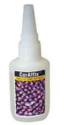 CorAffix is an ethyl cyanoacrylate bonding compound with viscosity similar to honey. Use it for attaching stony corals, gorgonians, and other sessile invertebrates in natural positions on the live rock in aquariums. Also for attaching coral “frags” in coral culturing. Use with AquaStik™ to attach larger coral heads. First put freshly mixed AquaStik on live rock. Push the coral base into the AquaStik and then remove the coral, leaving the impression of the coral base in the AquaStik left in place on the live rock. Allow the AquaStik to harden for 20 minutes. Next put CorAffix on the coral base and press it into the impression made in the AquaStik, forming a secure bond in 20 seconds. Available in a 2 oz bottle with an elongated tip that can be cut to the desired orifice size.